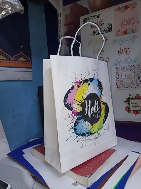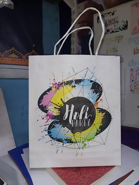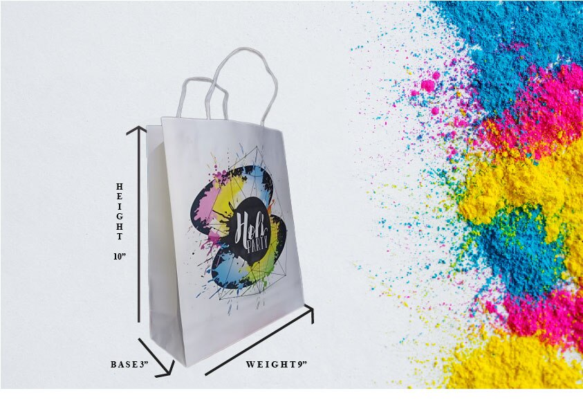 Cute paper bag of Holi theme, size 10/9/3" Holi theme printed exclusive, can be used multiple purpose without a specific occasion to mention Theme print bag with paper handle. Height - 10 Inches Weight - 9 Inches base - 3 Inches